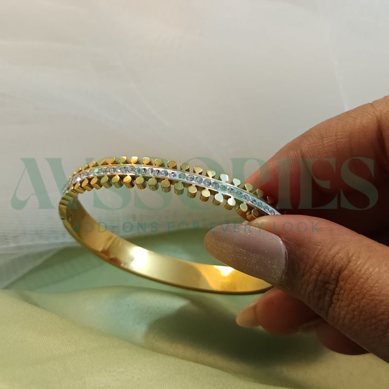 The Diamond Highway Kada features a sleek design lined with sparkling diamond-like stones, creating a stylish pathway of shine. With its anti-tarnish finish, it keeps its brilliance while adding a modern and elegant touch to your look.